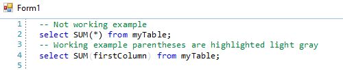 select SUM(firstColumn) from myTable;But if the previous or next character of parentheses is a special character, it does not recognize the parentheses as operators.