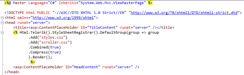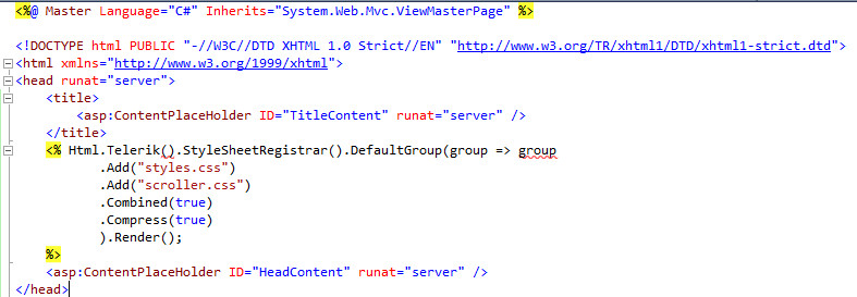 <% Html.Telerik().StyleSheetRegistrar().DefaultGroup(group => group .Add("styles.css") .Add("scroller.css") .Combined(true) .Compress(true) ).Render();%>I've attached two images that show what they look like in my VS 2010 Pro. The page is rendering just fine, but when I hover my mouse over the squiggle, it tells me: "Several methods are applicable to ()".