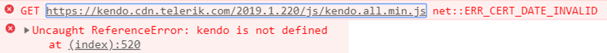 We have faced some issues while updating the SSL certificate of the Kendo CDN service. We are currently working on that. As soon as the issue has been resolved, we will update the following forum tread: https://www.telerik.com/forums/kendo-cdn-ssl-expired.