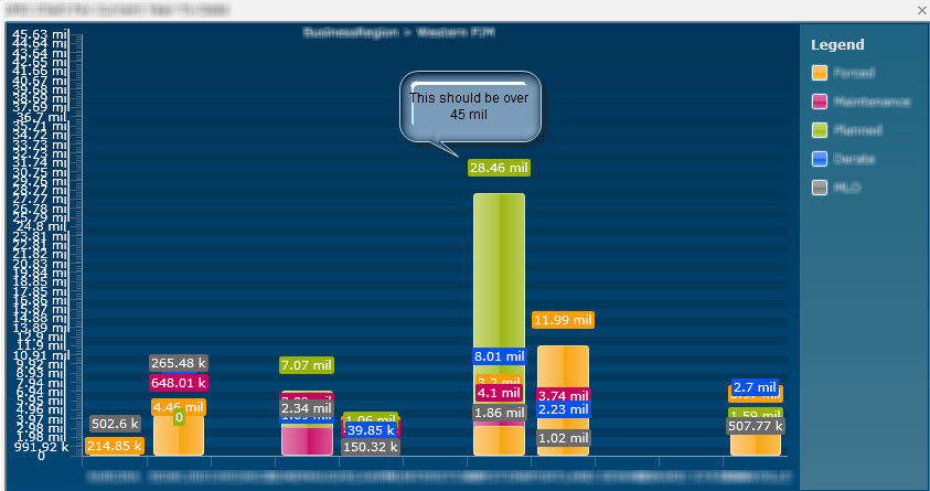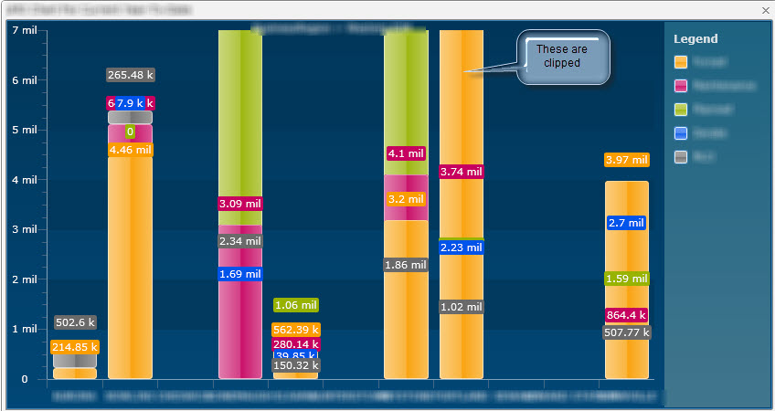 void GetViewCompleted(object sender, GetViewCompletedEventArgs e) { txtUnAssignedMsg.Visibility = Visibility.Collapsed; SetChart("MyXThing", Y1, Y2, Y3, Y4, Y5); if (e.Result.Count > 0) { radChart1.ItemsSource = e.Result; #region Manipulating the Y Axis span double sum = 0; foreach (var fleetView in e.Result) { sum = Math.Max(sum, fleetView.Series1 + fleetView.Series2 + fleetView.Series3 + fleetView.Series4 + fleetView.Series5); } ChartArea chartArea = radChart1.DefaultView.ChartArea; chartArea.AxisY.AutoRange = true; double min = chartArea.AxisY.ActualMinValue; double max = chartArea.AxisY.ActualMaxValue; double step = chartArea.AxisY.ActualStep; chartArea.AxisY.AutoRange = false; //chartArea.AxisY.MaxValue = sum; // This throws an exception chartArea.AxisY.AddRange(min, sum, step); // This gives me an unreadable scale #endregion } }This results in an even more messed up chart as seen in the attached "bar chart with modified y maximum.jpg". What is the best way to ensure that large outlying stacked bar charts are not clipped?public void SetChart(string strXValue, string y1, string y2, string y3, string y4, string y5) { radChart1.ItemsSource = null; radChart1.SeriesMappings.Clear(); const int distance = 15; MapPresentationToStackedBarChart(strXValue, y1, distance, SERIES1); MapPresentationToStackedBarChart(strXValue, y2, distance, SERIES2); MapPresentationToStackedBarChart(strXValue, y3, distance, SERIES3); MapPresentationToStackedBarChart(strXValue, y4, distance, SERIES4); MapPresentationToStackedBarChart(strXValue, y5, distance, SERIES5); }private void MapPresentationToStackedBarChart(string strXValue, string yValue, int distance, string series) { if (!string.IsNullOrEmpty(yValue)) { var mapping5 = new SeriesMapping(); mapping5.ItemMappings.Add(new ItemMapping() { AggregateFunction = ChartAggregateFunction.None, DataPointMember = DataPointMember.XCategory, FieldName = strXValue }); mapping5.ItemMappings.Add(new ItemMapping(series, DataPointMember.YValue, ChartAggregateFunction.None)); var sbsd5 = new StackedBarSeriesDefinition {LabelSettings = {LabelDisplayMode = LabelDisplayMode.Outside, Distance = distance}}; mapping5.SeriesDefinition = sbsd5; mapping5.LegendLabel = yValue; radChart1.SeriesMappings.Add(mapping5); } }