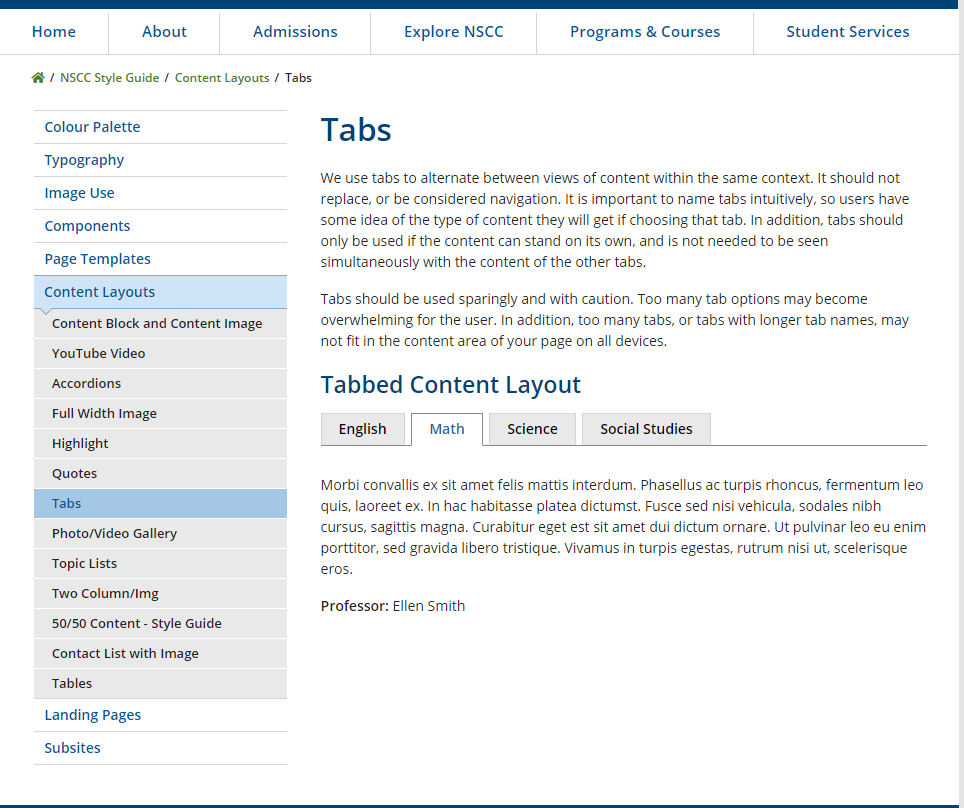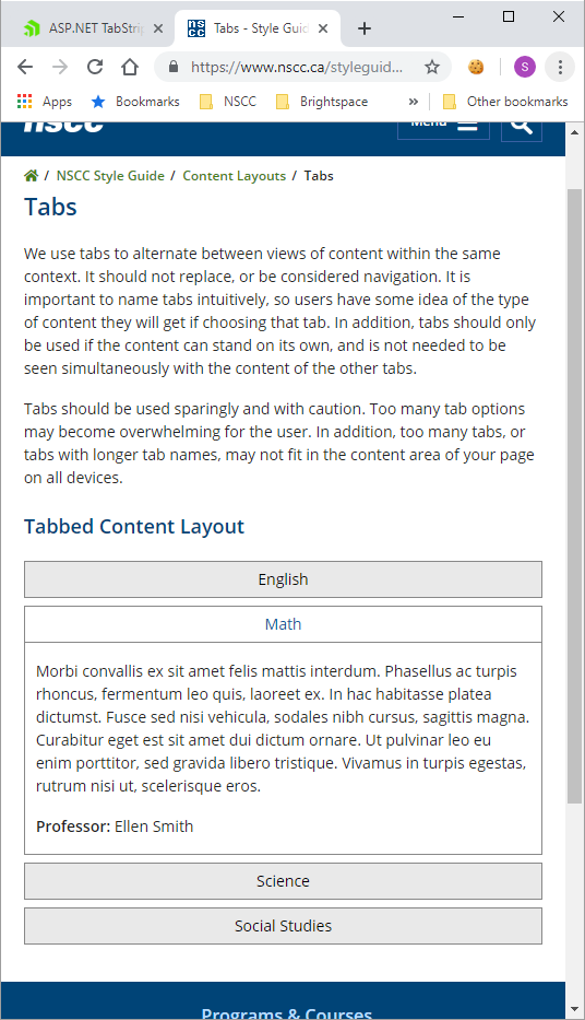 Rumen, I showed this to our designer (sorry, web design not my strength) and she indicated how we as an organization want to display tabbed content as indicated in our styleguide: https://www.nscc.ca/styleguide/content-layouts/content-layout-007.asp. This is done with jquery tabs.