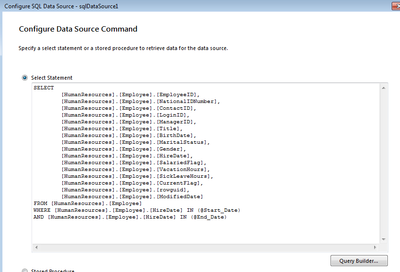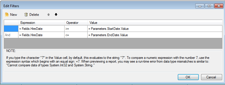 Using the AdventureWords DB, I setup the parameters and filters per the example for Employee Hire Date and Employee ID.