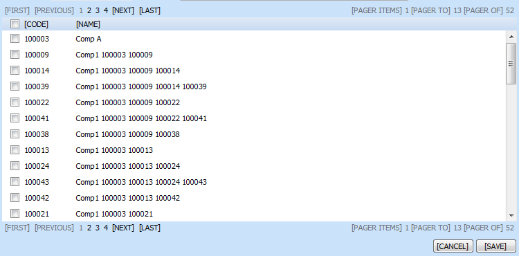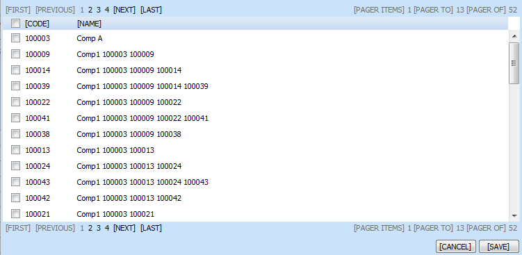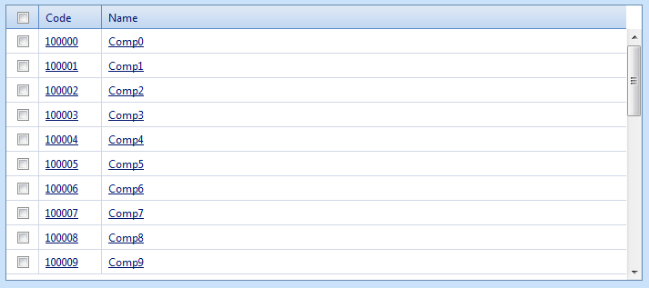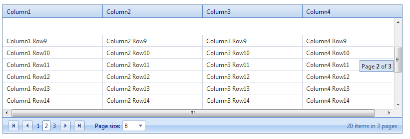 Third, (as I had already noted) I can't change the background color of the grid. As a demonstration of why, I've used the server-side command "grid.BackColor" (my grid is created in Page_Init) to set the grid background color to the same color as our custom pager bar (see the result in bluegrid.png). I played around with this a little by setting my MasterTableView background color to white, which looks ok unless there are fewer records than the scroll height or until you're partway through a virtual-scroll (see scrollgrid.png). In those cases the blue background color shows -- I would like that empty space to be white.