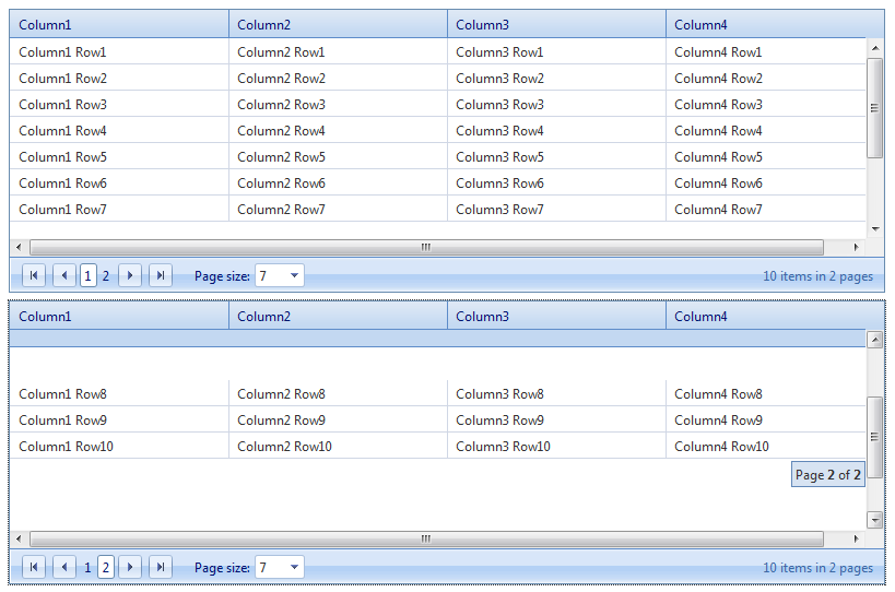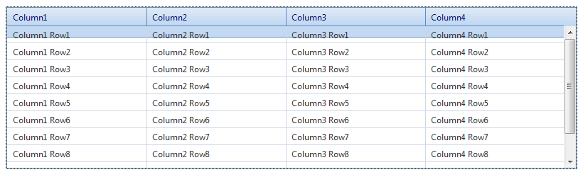 <%@ Page Language="C#" %> <%@ Import Namespace="System.Data" %> <%@ Register Assembly="Telerik.Web.UI" Namespace="Telerik.Web.UI" TagPrefix="telerik" %> <script runat="server"> protected void RadGrid_NeedDataSource(object sender, GridNeedDataSourceEventArgs e) { DataTable dt = new DataTable(); DataRow dr; int colsNum = 4; int rowsNum = 10; string colName = "Column"; for (int j = 1; j <= colsNum; j++) { dt.Columns.Add(String.Format("{0}{1}", colName, j)); } for (int i = 1; i <= rowsNum; i++) { dr = dt.NewRow(); for (int k = 1; k <= colsNum; k++) { dr[String.Format("{0}{1}", colName, k)] = String.Format("{0}{1} Row{2}", colName, k, i); } dt.Rows.Add(dr); } (sender as RadGrid).DataSource = dt; } </script> <!DOCTYPE html PUBLIC "-//W3C//DTD XHTML 1.0 Transitional//EN" <html xmlns="http://www.w3.org/1999/xhtml"> <head id="Head1" runat="server"> <meta http-equiv="content-type" content="text/html;charset=utf-8" /> <title>RadControls</title> <telerik:RadCodeBlock ID="RadCodeBlock1" runat="server"> <style type="text/css"> div.RadGrid_Default { background:0 -7550px repeat-x url('<%= Page.ClientScript.GetWebResourceUrl(typeof(RadGrid), "Telerik.Web.UI.Skins.Office2007.Grid.sprite.gif")%>'); } </style> </telerik:RadCodeBlock> </head> <body> <form id="form1" runat="server"> <asp:ScriptManager ID="ScriptManager1" runat="server" /> <telerik:RadGrid ID="RadGrid1" runat="server" Width="800px" Skin="Office2007" OnNeedDataSource="RadGrid_NeedDataSource"> <ClientSettings> <Scrolling AllowScroll="true" UseStaticHeaders="true" ScrollHeight="200px" /> </ClientSettings> </telerik:RadGrid> </form> </body> </html>All the best,