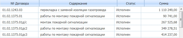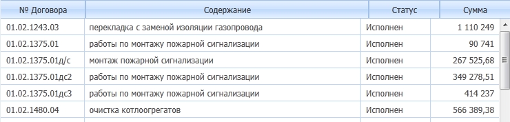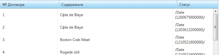 <telerik:RadGrid ID="RadGridSearchDog" runat="server" GridLines="None"Height="460px" Width="740px" AutoGenerateColumns="False"OnPreRender="RadGrid_PreRender" EnableEmbeddedSkins="False"AllowSorting="True" Culture="ru-RU"><ClientSettings><DataBinding FilterParameterType="Linq" Location="FinanceService.asmx"SelectMethod="GetDogovorDataLinq" SortParameterType="Linq"></DataBinding><Selecting AllowRowSelect="True" /><ClientEvents OnCommand="function(){}" OnRowDblClick="OnRowDblClickDogGrid"OnDataBinding="RadGridDogovor_DataBinding"OnDataBound="OnDataBoundGridDog" OnRowDataBound="OnRowDataBoundDog" /><Scrolling AllowScroll="True" UseStaticHeaders="True"/></ClientSettings><MasterTableView ClientDataKeyNames="CTR_ID" NoMasterRecordsText="Нет данных для отображения"><Columns><telerik:GridBoundColumn DataField="CTR_ID"HeaderText="Код" UniqueName="CTR_ID" Visible="false"></telerik:GridBoundColumn><telerik:GridBoundColumn DataField="CTR_NUM"HeaderText="№ Договора" UniqueName="CTR_NUM"><HeaderStyle Width="120px"></HeaderStyle><ItemStyle Width="120px"></ItemStyle></telerik:GridBoundColumn><telerik:GridBoundColumn DataField="CTR_DATE_REG" HeaderText="Регистрация" DataType="System.DateTime"UniqueName="CTR_DATE_REG" DataFormatString="{0:dd.MM.yyyy}" Visible="false"><HeaderStyle HorizontalAlign="Center"></HeaderStyle><ItemStyle HorizontalAlign="Right"></ItemStyle></telerik:GridBoundColumn><telerik:GridBoundColumn DataField="CTR_CONTENT"HeaderText="Содержание"UniqueName="CTR_CONTENT"><HeaderStyle Width="400px"></HeaderStyle><ItemStyle Width="400px"></ItemStyle></telerik:GridBoundColumn><telerik:GridBoundColumn DataField="CTR_STATUS_EXPLAINED"HeaderText="Статус"UniqueName="CTR_STATUS_EXPLAINED"><HeaderStyle Width="100px"></HeaderStyle><ItemStyle Width="100px"></ItemStyle></telerik:GridBoundColumn><telerik:GridCalculatedColumn DataFields="CTR_AMOUNT" HeaderText="Сумма" DataType="System.Decimal"UniqueName="CTR_AMOUNT" Expression="{0}" SortExpression="CTR_AMOUNT"><HeaderStyle Width="100px" HorizontalAlign="Center" ></HeaderStyle><ItemStyle Width="100px" HorizontalAlign="Right"></ItemStyle ></telerik:GridCalculatedColumn></Columns></MasterTableView>