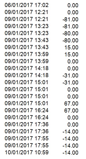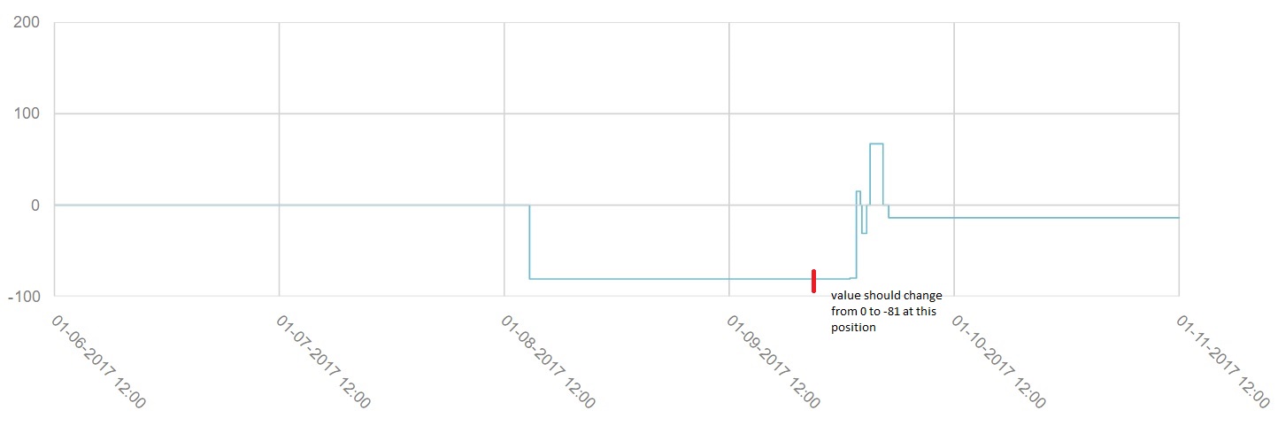 Based on the attached screenshot 2, it seems that you have two values for 09/01/2017 12:21 category: those are "0" and "-81". Thus, the data point will be the sum of those values (-81) as correctly displayed by the Graph item - screenshot 1.