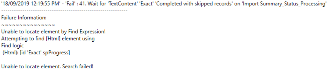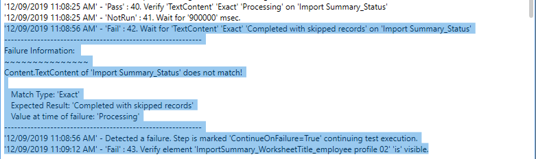 1. To achieve waiting for TextContent "Completed with Skipped Records", I need to enable both UseStepWaitOnElementsTimeOut and step Time Out (in Step Properties) at the same time. This will successfully wait until TextContent "Completed with Skipped Records" appear then proceed with the next steps.