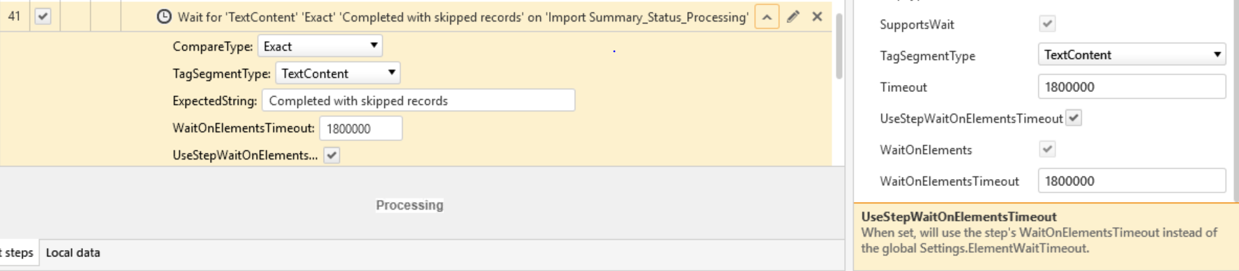 So is it right that, to achieve the goal of waiting for TextContent "Completed with Skipped Records" to appear, I need both step Time Out (in Step Properties) and UseStepWaitOnElementsTimeOut?