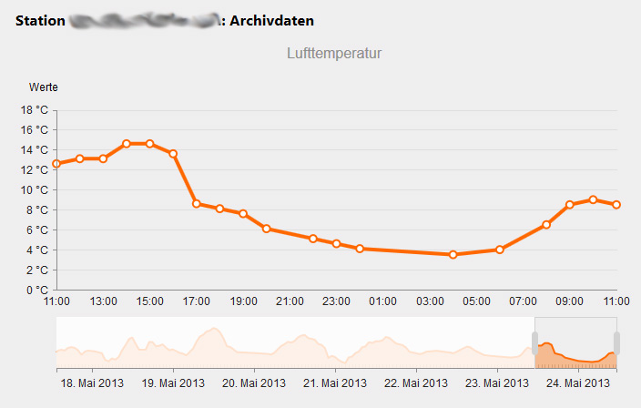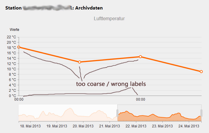 When I want to show, lets say, a temperature chart for a given time period of 1 week (which is shown as a whole in the navigator as an area chart), and the current selection covers an interval of 3 days, the automatic aggregation in he upper chart displays about 26 values. When I then enlarge the selection to 3.5 or 4 days, the upper chart jumps to a much coarser display.