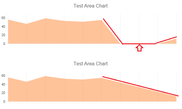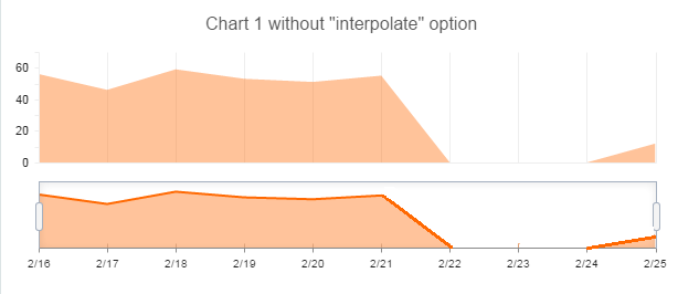 $("#stock-chart").kendoStockChart({ dataSource: data, transitions: false, title: { text: "Test Area Chart", color: "#565656" }, series: [{ type: "area", field: "Count", categoryField: "Date", missingValues : "interpolate", tooltip: { template: "#= kendo.toString(category, 'MM/dd/yyyy') #: #= value # items" } }], navigator: { series: [{ type: "area", field: "Count", categoryField: "Date", missingValues : "interpolate", }], categoryAxis: { baseUnit: "days", labels: { visible: true, font: "10px sans-serif" } } }, chartArea: { width: 600, height: 250 }, categoryAxis: { majorGridLines: { visible: true, color: "#eeeeee", step: 1 }, labels: { visible: false }, line: { color: "#eeeeee" }, baseUnit: "days" }, valueAxis: { majorGridLines: { visible: false }, labels: { font: "11px sans-serif", template: "#= value #", step: 2 }, line: { color: "#eeeeee" } }});I created new DEMO that has 2 StockCharts: first one with { missingValues: "zero" }, the second one with { missingValues: "interpolate" }