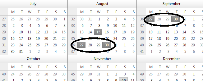I am using a RadCalendar control in my web page, to allow users to select/deselect non working days. I have it so there are 12 views displayed at once (3 x 4 grid). This means I can get a whole year's worth into one page.