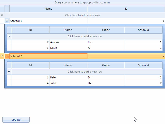 BindingList<Student> collectionOfStudents = new BindingList<Student>();BindingList<School> collectionOfSchools = new BindingList<School>();public Form1(){ InitializeComponent(); collectionOfStudents.Add(new Student(1, "Peter", "D-",2)); collectionOfStudents.Add(new Student(2, "Antony", "B+",1)); collectionOfStudents.Add(new Student(3, "David", "A-",1)); collectionOfStudents.Add(new Student(4, "John", "D-",2)); collectionOfSchools.Add(new School("Schrool 1",1)); collectionOfSchools.Add(new School("Schrool 2",2)); radGridView1.DataSource = collectionOfSchools; radGridView1.AutoSizeColumnsMode = GridViewAutoSizeColumnsMode.Fill; GridViewTemplate template = new GridViewTemplate(); template.DataSource = collectionOfStudents; template.AutoSizeColumnsMode = GridViewAutoSizeColumnsMode.Fill; radGridView1.MasterTemplate.Templates.Add(template); GridViewRelation relation = new GridViewRelation(radGridView1.MasterTemplate); relation.ChildTemplate = template; relation.RelationName = "SchoolsStudents"; relation.ParentColumnNames.Add("Id"); relation.ChildColumnNames.Add("SchoolId"); radGridView1.Relations.Add(relation);}public class School: System.ComponentModel.INotifyPropertyChanged{ string _name; int _id; public School(string name, int id) { this._name = name; this._id = id; } public string Name { get { return this._name; } set { this._name = value; OnPropertyChanged("Name"); } } public int Id { get { return this._id; } set { this._id = value; OnPropertyChanged("Id"); } } public event PropertyChangedEventHandler PropertyChanged; protected virtual void OnPropertyChanged(string propertyName) { if (PropertyChanged != null) { PropertyChanged(this, new PropertyChangedEventArgs(propertyName)); } }}public class Student : System.ComponentModel.INotifyPropertyChanged{ int m_id; string m_name; string m_grade; int school_id; public event PropertyChangedEventHandler PropertyChanged; public Student(int m_id, string m_name, string m_grade, int s_id) { this.m_id = m_id; this.m_name = m_name; this.m_grade = m_grade; this.school_id = s_id; } public int Id { get { return m_id; } set { if (this.m_id != value) { this.m_id = value; OnPropertyChanged("Id"); } } } public string Name { get { return m_name; } set { if (this.m_name != value) { this.m_name = value; OnPropertyChanged("Name"); } } } public string Grade { get { return m_grade; } set { if (this.m_grade != value) { this.m_grade = value; OnPropertyChanged("Grade"); } } } public int SchoolId { get { return this.school_id; } set { this.school_id = value; OnPropertyChanged("SchoolId"); } } protected virtual void OnPropertyChanged(string propertyName) { if (PropertyChanged != null) { PropertyChanged(this, new PropertyChangedEventArgs(propertyName)); } }}private void radButton1_Click(object sender, EventArgs e){ collectionOfStudents[1].Name = "Name" + DateTime.Now.ToLongTimeString();}The following help article demonstrates how to reflect custom object changes in RadGridView: http://docs.telerik.com/devtools/winforms/gridview/populating-with-data/reflecting-custom-object-changes-in-rgv