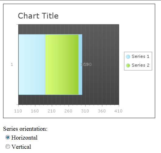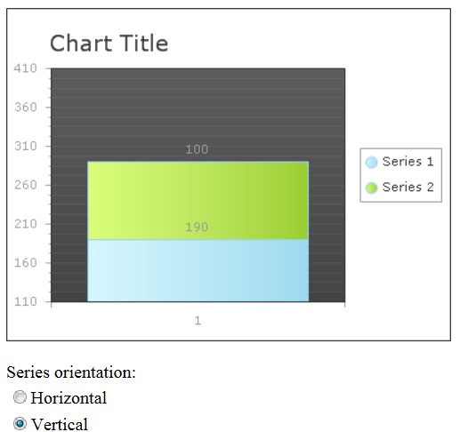 <%@ Page Language="C#" AutoEventWireup="true" CodeFile="Stackbar2.aspx.cs" Inherits="Stackbar2" %><%@ Register assembly="Telerik.Web.UI" namespace="Telerik.Charting" tagprefix="telerik" %><!DOCTYPE html PUBLIC "-//W3C//DTD XHTML 1.0 Transitional//EN" "http://www.w3.org/TR/xhtml1/DTD/xhtml1-transitional.dtd"><html xmlns="http://www.w3.org/1999/xhtml"><head runat="server"> <title></title></head><body> <form id="form1" runat="server"> <telerik:RadScriptManager ID="RadScriptManager1" runat="server"> </telerik:RadScriptManager> <div> <telerik:RadChart ID="RadChart1" runat="server" DefaultType="StackedBar" SeriesOrientation="Vertical"> <Series> <telerik:ChartSeries Name="Series 1" Type="StackedBar"> <Items> <telerik:ChartSeriesItem Name="Item 1" YValue="190"> </telerik:ChartSeriesItem> </Items> </telerik:ChartSeries> <telerik:ChartSeries Name="Series 2" Type="StackedBar"> <Items> <telerik:ChartSeriesItem Name="Item 1" YValue="100" > </telerik:ChartSeriesItem> </Items> </telerik:ChartSeries> </Series> </telerik:RadChart> <br /> <asp:Label ID="lblChartOrientation" runat="server" Text="Series orientation:" /><asp:RadioButtonList AutoPostBack="true" ID="OrientationList" runat="server" OnSelectedIndexChanged="OrientationList_SelectedIndexChanged"><asp:ListItem Text="Horizontal" Value="Horizontal" /><asp:ListItem Text="Vertical" Value="Vertical" Selected="True" /></asp:RadioButtonList> </div> </form> </body> </html> using System;using System.Collections.Generic;using System.Linq;using System.Web;using System.Web.UI;using System.Web.UI.WebControls;using Telerik.Charting;using System.Drawing;public partial class Stackbar2 : System.Web.UI.Page{ protected void Page_Load(object sender, EventArgs e) { if(!IsPostBack) Settings(); } private void Settings() { ChartSeriesCollection coll = RadChart1.Series; for (int i = 0; i < coll.Count; i++) { } double yMin=110; double yMax=400; double step = 50; RadChart1.PlotArea.YAxis.AddRange(yMin, yMax, step); RadChart1.PlotArea.YAxis.AutoScale = false; } protected void OrientationList_SelectedIndexChanged(object sender, EventArgs e) { RadChart1.SeriesOrientation = (ChartSeriesOrientation)Enum.Parse(typeof(ChartSeriesOrientation), OrientationList.SelectedValue); }}