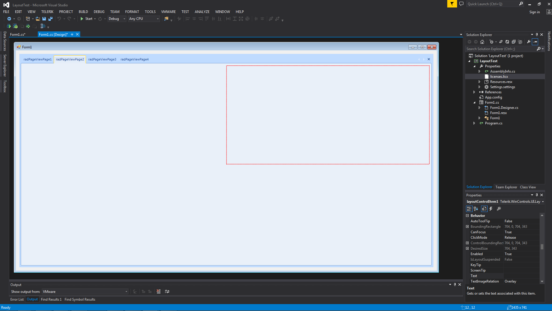 I've attached images, page1.png shows how I've setup a sample project with a form that has a pageview with four pages and a RadLayoutControl containing a RadButton, RadTextBox, RadRichTextBox, and a RadLabel; in page2.png I've clicked on the top right area and have selected layoutControlItem1 that is contained on the first RadPageView in the RadLayoutControl.