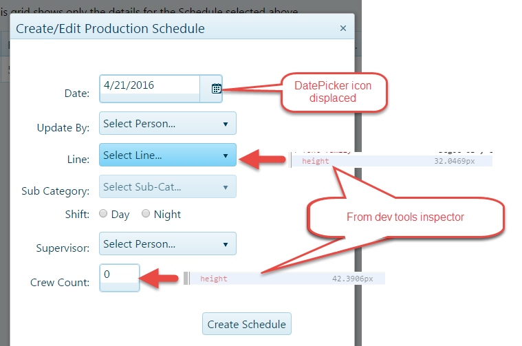 In the attached screenshot, you can see that the DropDownList and other controls that are either Kendo controls or style by Kendo theme look normal, but the datePicker and NumericTextBox have a thick blue padding at the bottom. And the datePicker's icon is displaced to the right.