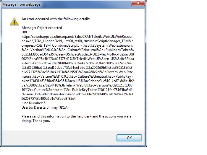 I have a page with SQL 2012 Report Viewer on it and using my global clientside error handling I get occassionally a popup telling me an error is occuring within the Telerik.Web.UI.WebResource.axd (attached). It is an Object Expected error. I have tried several things to eliminate, but have failed. Below is my html code for the page. I am only including parts of the master page. Note I had to use the UpdatePanel as the report viewer had issues with the Ajax Manager and it doing ajax calls.