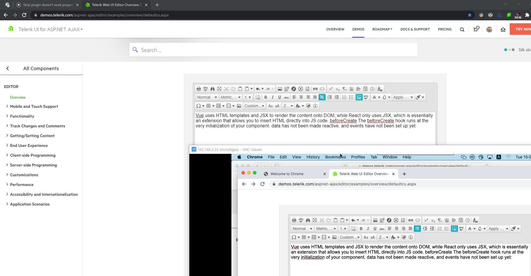 Our customer found strip plugin doesn't work properly on MAC OS not matter what browser they choose ( Chrome and Safari ). We found the same issue on Telerik editor demo site too. Is there any walk-around or coming release to fix the issue ?