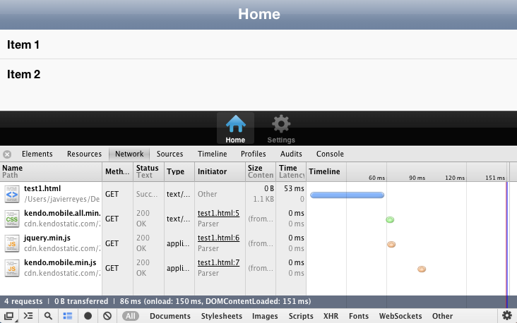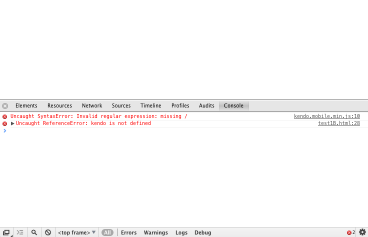 I am trying to take step #1 using Kendo mobile and having a problem. I have set up a folder containing a copy of the "js" and "styles" folders from my downloaded Kendo Trial distribution and created a test.html file with the so called "first complete example" in http://docs.kendoui.com/getting-started/introduction which has the following code: