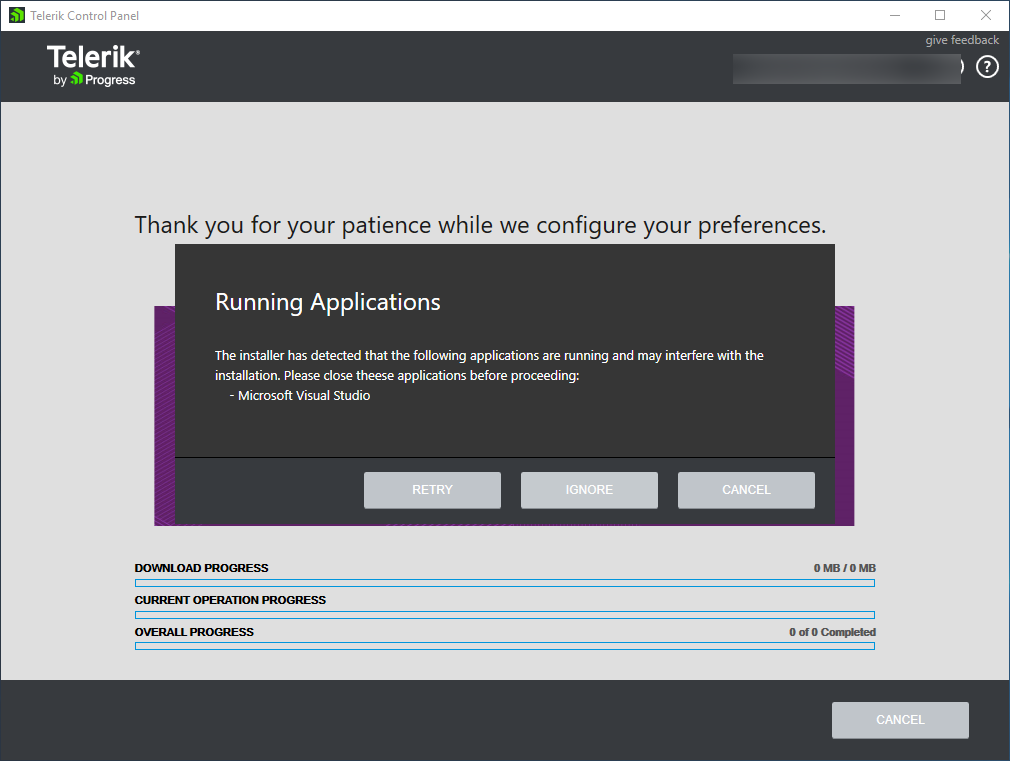 I had VS2015 Enterprise open whilst I updated the installer. The setup warned me - however all 3 buttons Retry, Ignore, Cancel are greyed out. I closed VS2015 (had to kill devenv.exe) and buttons still greyed out. The window is unresponsive - cant close it. See attached.