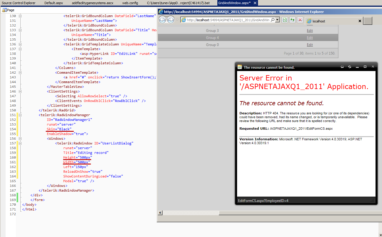 <telerik:RadWindowManager ID="RadWindowManager1" runat="server"> <Windows> <telerik:RadWindow ID="UserListDialog" runat="server" Title="Editing record" Height="300px" Width="300px" Left="150px" ReloadOnShow="true" ShowContentDuringLoad="false" Modal="true" /> </Windows> </telerik:RadWindowManager>This RadWindow (UserListDialog) is the window opened when you click the Edit link. You can set the appearance from the markup, or as an alternative - in the ShowInsertForm() function, by using RadWindow's client-side API.
