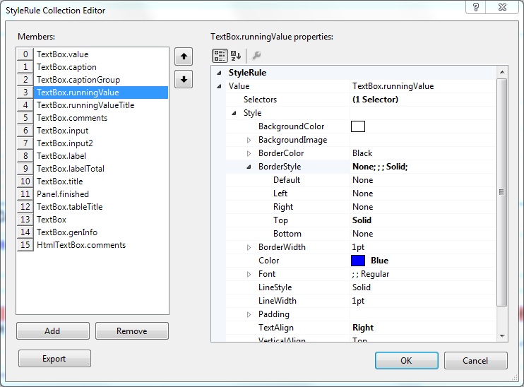My style rules are simply "Textbox.StyleName" selectors such as "value, caption, input", but there are a ton of textboxes on my Report.