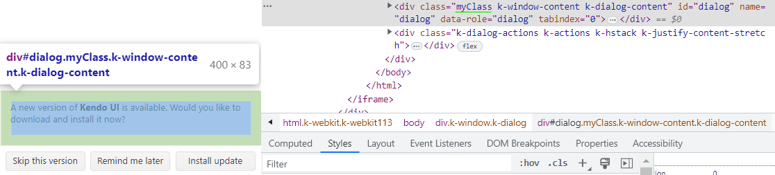 I'm wondering if there is any support for styling a Dialog in the .net core version of telerik that I am trialling right now? The documentation lists the ability to add a cssclass but that is only for the button, not for the entire dialog itself, I need to replicate previous functionality we were using where a cssclass is applied to the object in javascript when the dialog has been open for a certain amount of time.