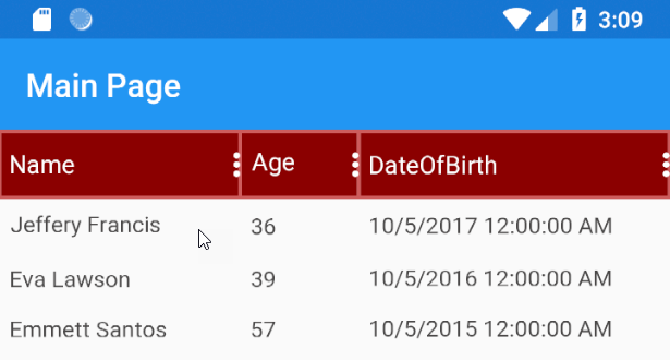 <dataGrid:RadDataGrid x:Name="MyDataGrid" AutoGenerateColumns="False"> <dataGrid:RadDataGrid.Columns> <dataGrid:DataGridTextColumn PropertyName="Name" HeaderStyle="{StaticResource EveryColumnHeaderStyle}" /> <dataGrid:DataGridNumericalColumn PropertyName="Age" HeaderStyle="{StaticResource EveryColumnHeaderStyle}" /> <dataGrid:DataGridDateColumn PropertyName="DateOfBirth" HeaderStyle="{StaticResource EveryColumnHeaderStyle}" /> </dataGrid:RadDataGrid.Columns></dataGrid:RadDataGrid>Here's the result at runtime:
