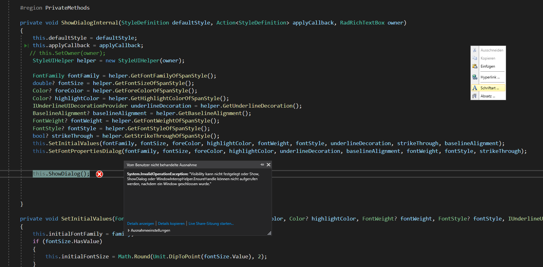 2) If I open the Dialog the 2nd time, the application crashed on the "this.ShowDialog()" method call.