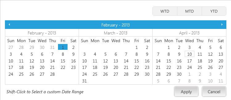 Thanks for your help, it's been very useful. I have another question for you though. I'm running into an issue where if I select a date in the future the calendar will automatically shift the months such that the right most month is now the left most and all the dates between today's date and the date under the cursor are selected.