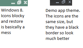 All is working as you'd expect. My issue is with the min/max/close icons on the form. They look too block and thick, particularly when maximized. The restore icon in especially blob like. Is there a way to change the styling of these buttons to use finer lines, or an outline similar to the office style?