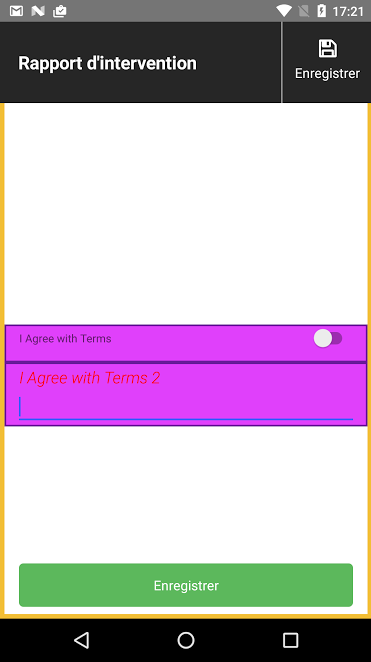 <RadDataForm [source]="data" (propertyCommit)="dfPropertyCommit($event)" (propertyCommitted)="dfPropertyCommitted($event)" commitMode="Manual" validationMode="OnLostFocus"> <TKEntityProperty tkDataFormProperty name="val1" displayName="I Agree with Terms 2" index="9"> <TKPropertyEditor tkEntityPropertyEditor type="Text"> <TKPropertyEditorStyle tkPropertyEditorStyle strokeColor="#6A1B9A" strokeWidth="2" fillColor="#E040FB" labelHidden="false" labelTextSize="18" ios:labelFontName="Times New Roman" android:labelFontName="sans-serif-light" labelFontStyle="Italic" labelTextColor="red"> </TKPropertyEditorStyle> </TKPropertyEditor> </TKEntityProperty> <TKEntityProperty tkDataFormProperty name="val2" displayName="I Agree with Terms" index="10"> <TKPropertyEditor tkEntityPropertyEditor type="Switch"> <TKPropertyEditorStyle tkPropertyEditorStyle strokeColor="#6A1B9A" strokeWidth="2" fillColor="#E040FB" labelHidden="false" labelTextSize="18" ios:labelFontName="Times New Roman" android:labelFontName="sans-serif-light" labelFontStyle="Italic" labelTextColor="red"> </TKPropertyEditorStyle> </TKPropertyEditor> </TKEntityProperty> </RadDataForm>