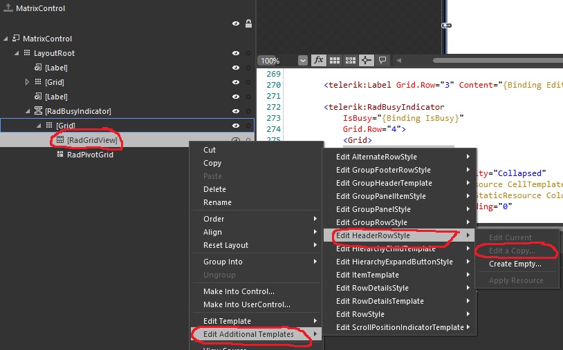 Further more, if I choose Edit Template > Edit a Copy on the same RadGridView, I just get an empty slate; no objects, properties or states?? Generated XAML is then this empty ControlTemplate: