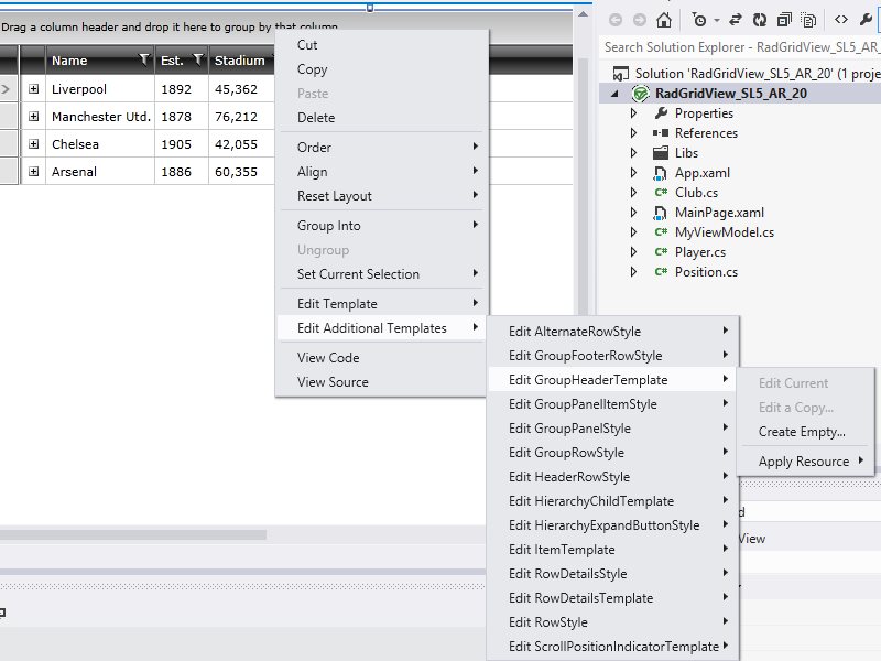 Example project here: https://dl.dropboxusercontent.com/u/1027259/Examples/Telerik.Silverlight.GridView.2013.2.724.1050.zip