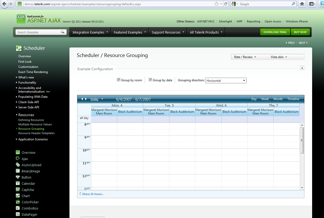 I want to implement sub grouping for radscheduler by using multiple Resources. For example i have two multi select drop down lists with names State and City. If the user selects multiple values from both State and City in this senario i have to do main group based on State and sub group based on City. From your live demo links i am attaching sample image please find. From the below attached file, i want to show the State in the place of Date after that i have to do sub group based on respective cities under that state.