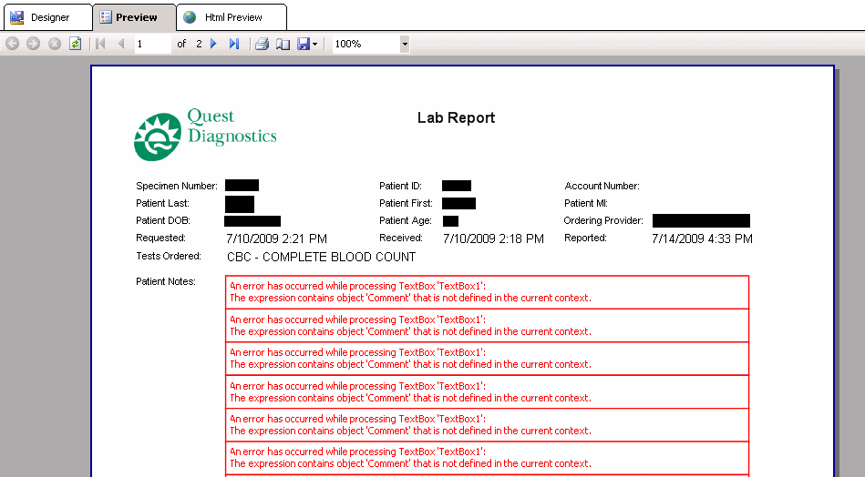 An error has occurred while processing TextBox 'TextBox1': The expression contains object 'Name' that is not defined in the current context.