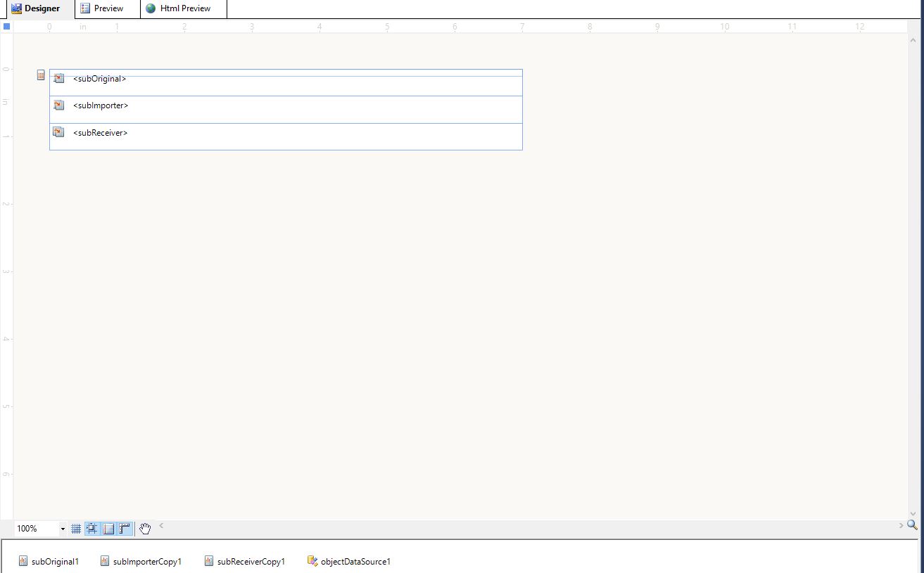 I have a main report and 3 sub reports. I referred to the telerik documentation and the forum. I have a objectdatasource in the main report and the sub report relies on the parent datasource --> =MainReport.objectDataSource1. I have also set field value to =MainReport.objectDataSource1.FieldName in the subreport.