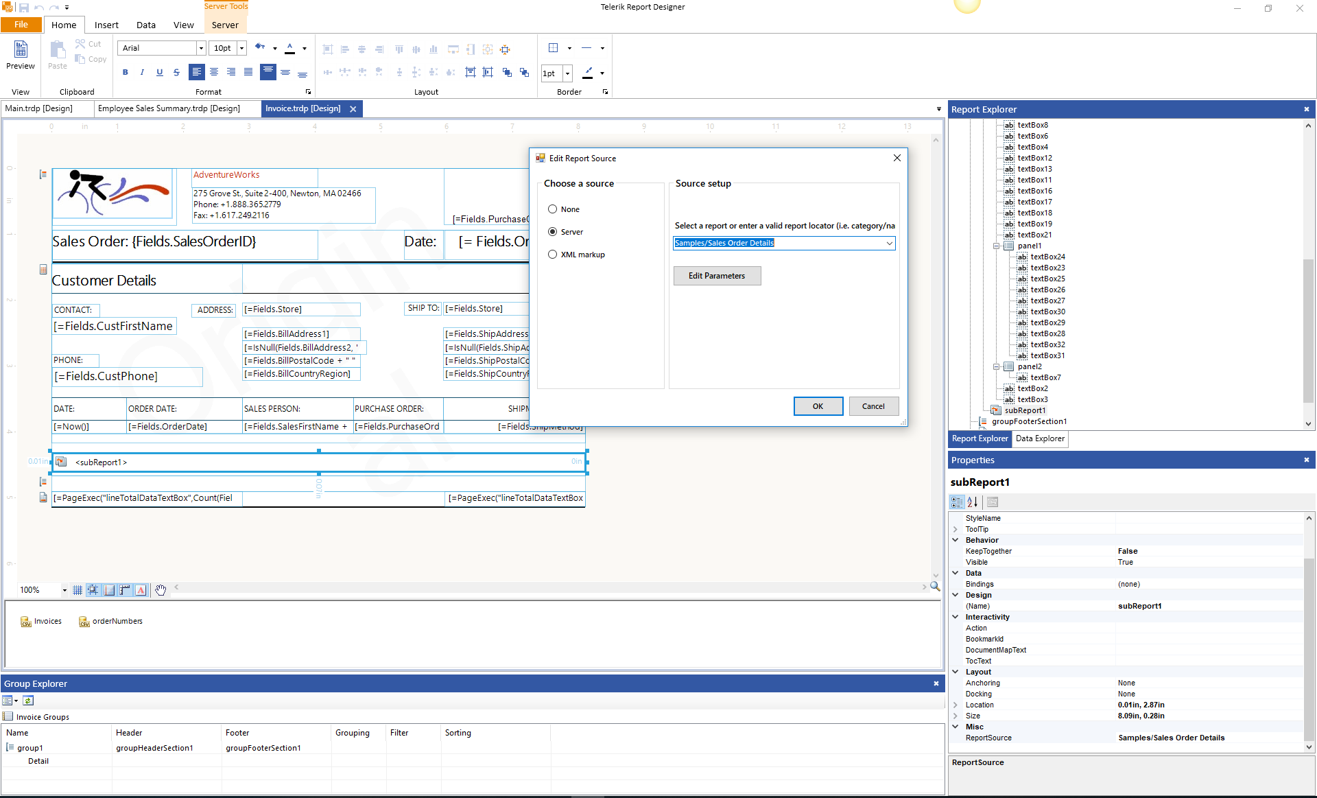 You can also check the initially added reports when you install the Report Server. Sales Order Details contains a subreport. When you download it you can see how the report source is set. Please, take a look at the attached screenshot for additional reference.