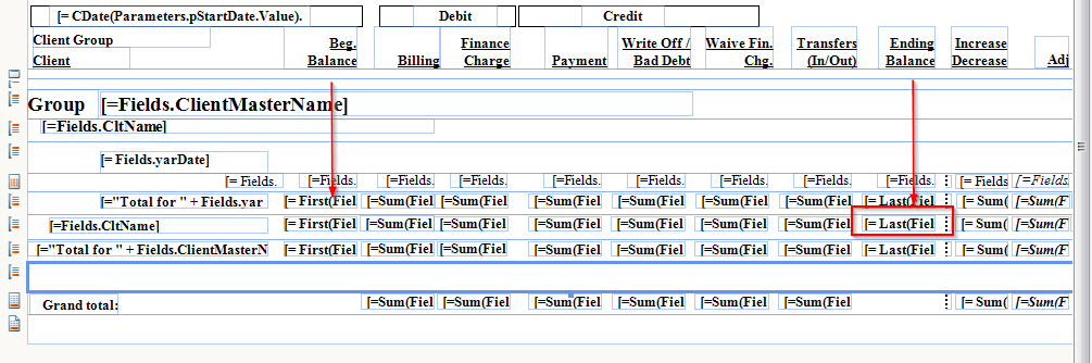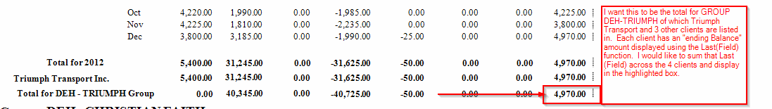 I have 3 group sections on the report where group 2 ("CltName") has a few summary fields as well as a Last(xxx) field (lets call it "GroupEndBalance". I would like to create a summary field for "GroupEndBalance" in the "CltMasterNameGroup" but reporting will not allow a Sum(Last(xxx)) or a Sum(GroupEndBalance).