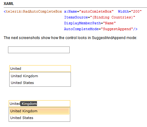 <telerik:RadAutoCompleteBox ItemsSource="{Binding Items}" SearchText="{Binding SearchText, Mode=TwoWay}" AutoCompleteMode="SuggestAppend" DisplayMemberPath="Name" WatermarkContent="Search for items"/>However, I don't see the Append text as shown in the attached image (see-this.png). Is this a bug or am I missing something?