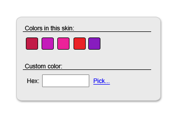 So... true! I'm attaching a screenshot of the best color picking interface that I had imagined - usually, one wants to use consistent colors in the skin (the "colors in this skin" part). If new colors are introduced, it is most probable that this would be through their hex code - and they should be automatically added to the "colors in this skin" section. Unfortunately, implementing such interface did not seem trivial with the current means (i.e. RadColorPicker). I guess only a hex field will do the trick for now, and I'll add it this week.