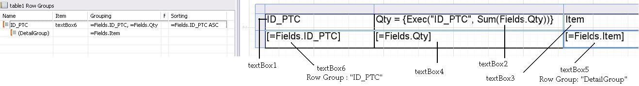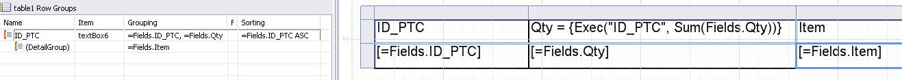 If you need to execute an aggregate under a different scope i.e. a row/column group, you need to specify it as first argument e.g. = Exec("rowgroupID", sum(Fields.Qty))