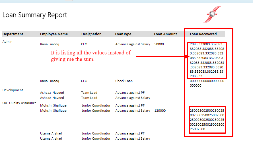 I'm working on a report in which I have to take Sum of a field, I'm using this expression right now. =Sum(Fields.ReceivedAmount).