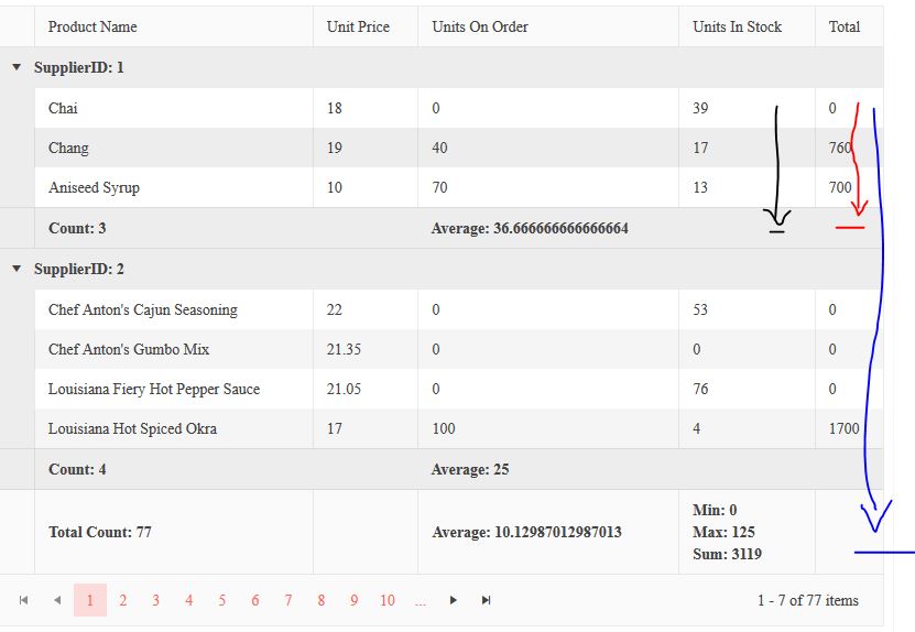 Also I would like to know why the sum for Units in Stocks is not working in the groupHeaderTemplate, blue line.
