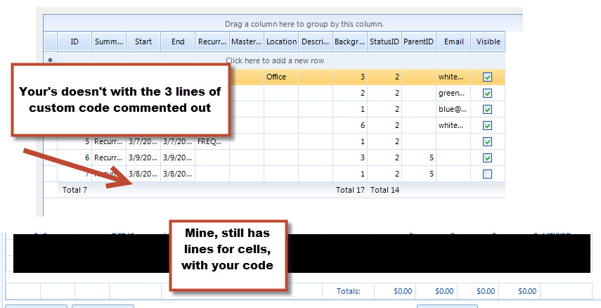 but that doesn't work for me unless the grid has a bunch of rows in it. when there's no rows or only a couple, the summary row is right under them. I need it at the bottom and also need it to only show for a couple columns. i added summary items for those columns and i do get totals, but all the other columns have what look to be cells under them that are just blank. can those be removed?