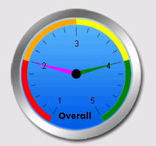 <style> #gaugecontainer { background-image: url(/Images/Gauge_blue_200.png); background-position: 0, 0; height: 200px; position: relative; width: 200px; } #gaugetitle { position: absolute; top: 150px; left: 75px; font-size: smaller; font-weight: bold; } .gaugetest { left: 18px; position: absolute !important; /* override the inline style of the gauge */ top: 10px; } </style><div id="gaugecontainer"> <div id="gaugetitle">Overall</div> <telerik:RadRadialGauge ID="RadRadialGauge1" runat="server" CssClass="gaugetest" Width="168px" Height="168px" > <Pointer Color="Fuchsia" Value="2"> <Cap Color="black" Size="0.1" /> </Pointer> <Scale Min="1" Max="5" MajorUnit="1" MinorUnit="0.2" EndAngle="240" StartAngle="-60"> <MinorTicks Color="Black" Width="0.4"/> <MajorTicks Color="Black" Width="0.7" /> <Labels Visible="False" /> <MajorTicks Visible="False" /> <Ranges> <telerik:GaugeRange Color="Red" From="1" To="2"/> <telerik:GaugeRange Color="Orange" From="2" To="3"/> <telerik:GaugeRange Color="Yellow" From="3" To="4"/> <telerik:GaugeRange Color="Green" From="4" To="5"/> </Ranges> </Scale> </telerik:RadRadialGauge> <telerik:RadRadialGauge ID="RadRadialGauge2" runat="server" CssClass="gaugetest" Width="168px" Height="168px"> <Pointer Color="Green" Value="4"> <Cap Color="black" Size="0.1" /> </Pointer> <Scale Min="1" Max="5" MajorUnit="1" MinorUnit="0.2" EndAngle="240" StartAngle="-60"> <MinorTicks Color="Black" Width="6"/> <MajorTicks Color="Black" Width="12" /> <Ranges> <telerik:GaugeRange Color="Red" From="1" To="2"/> <telerik:GaugeRange Color="Orange" From="2" To="3"/> <telerik:GaugeRange Color="Yellow" From="3" To="4"/> <telerik:GaugeRange Color="Green" From="4" To="5"/> </Ranges> </Scale> </telerik:RadRadialGauge> </div>I have also attached the background image and a shot of the finished article.