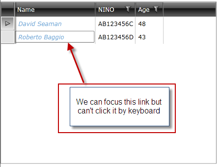<UserControl x:Class="SilverlightApplication6.MainPage" mc:Ignorable="d" xmlns:telerik="clr-namespace:Telerik.Windows.Controls;assembly=Telerik.Windows.Controls.GridView" d:DesignHeight="300" d:DesignWidth="400"> <Grid x:Name="LayoutRoot" Background="White"> <telerik:RadGridView AutoGenerateColumns="False" Width="400" Height="300" HorizontalAlignment="Left" x:Name="grClientData" AutomationProperties.HelpText="Client Data" ShowGroupPanel="False"> <telerik:RadGridView.Columns> <telerik:GridViewDataColumn Header="Name" Width="150" MinWidth="100" MaxWidth="150"> <telerik:GridViewColumn.CellTemplate> <DataTemplate> <HyperlinkButton x:Name="hplClientName" Tag="{Binding}" Content="{Binding UserName, Mode=TwoWay}" FontStyle="Italic" /> </DataTemplate> </telerik:GridViewColumn.CellTemplate> </telerik:GridViewDataColumn> <telerik:GridViewDataColumn Header="NINO" DataMemberBinding="{Binding NINO}" /> <telerik:GridViewDataColumn Header="Age" DataMemberBinding="{Binding Age}" /> </telerik:RadGridView.Columns> </telerik:RadGridView> </Grid> </UserControl>using System.Collections.Generic; using System.Windows.Controls; namespace SilverlightApplication6 { public partial class MainPage : UserControl { public MainPage() { InitializeComponent(); var clients = new List<Client> { new Client("David Seaman", "AB123456C", 48), new Client("Roberto Baggio", "AB123456D", 43) }; grClientData.ItemsSource = clients; } } } namespace SilverlightApplication6 { public class Client { public string UserName { get; set; } public string NINO { get; set; } public int Age { get; set; } public Client(string userName, string niNo, int age) { UserName = userName; NINO = niNo; Age = age; } } } Code-snippets creates a grid which has a hyperlink. We can move between cells (by keyboard), but can't click on hyperlink by using keyboard.