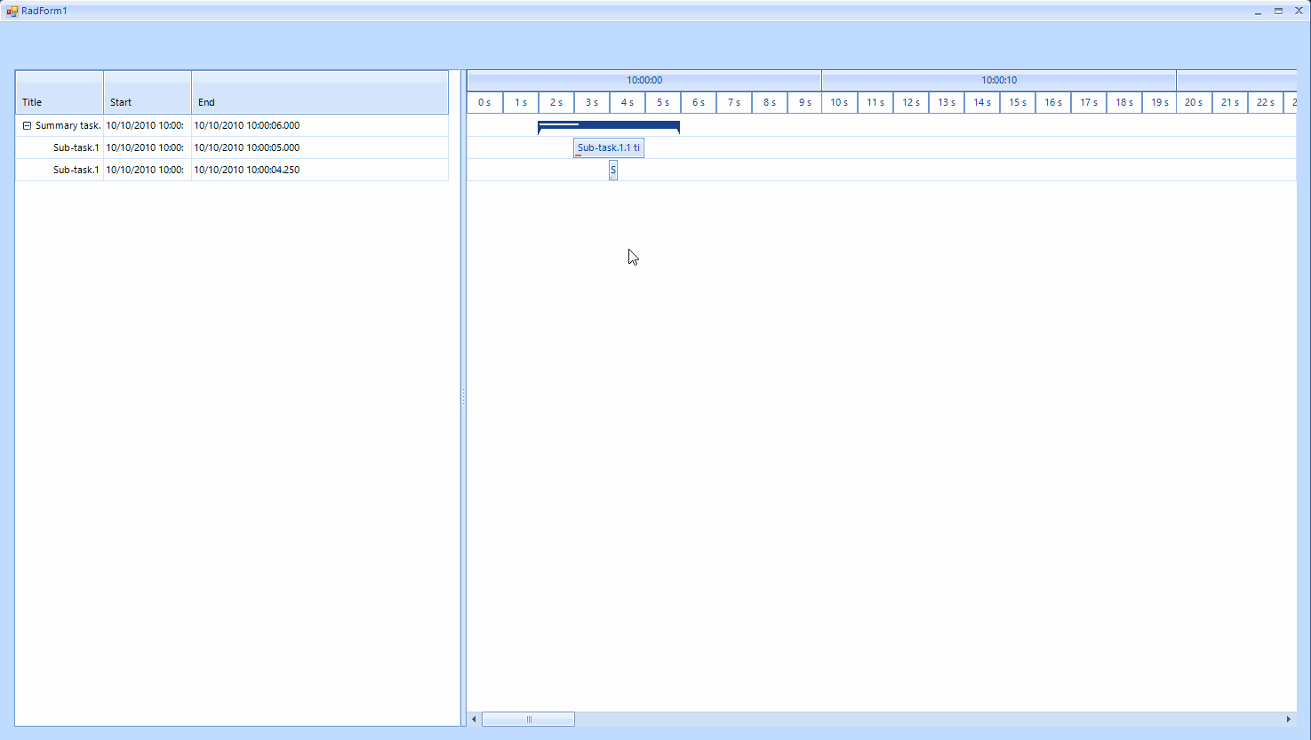 public partial class GanttForm : Telerik.WinControls.UI.RadForm{ public GanttForm() { InitializeComponent(); this.radGanttView1.Ratio = 0.35f; DateTime start = new DateTime(2010, 10, 10, 9, 0, 0); DateTime end = start.AddSeconds(10); this.radGanttView1.GanttViewElement.GraphicalViewElement.TimelineStart = start; this.radGanttView1.GanttViewElement.GraphicalViewElement.TimelineEnd = end; this.radGanttView1.GanttViewElement.GraphicalViewElement.TimelineRange = Telerik.WinControls.UI.TimeRange.DayQuarterHours; this.radGanttView1.GanttViewElement.GraphicalViewElement.OnePixelTime = new TimeSpan(0, 0, 0, 0, 25); //setup data items GanttViewDataItem item1 = new GanttViewDataItem(); item1.Start = start.AddSeconds(2); item1.End = start.AddSeconds(6); item1.Progress = 30m; item1.Title = "Summary task.1. title"; GanttViewDataItem subitem11 = new GanttViewDataItem(); subitem11.Start = start.AddSeconds(3); subitem11.End = start.AddSeconds(5); subitem11.Progress = 10m; subitem11.Title = "Sub-task.1.1 title"; GanttViewDataItem subitem12 = new GanttViewDataItem(); subitem12.Start = start.AddSeconds(4); subitem12.End = start.AddSeconds(4).AddMilliseconds(250); subitem12.Progress = 20m; subitem12.Title = "Sub-task.1.2 title"; //add subitems item1.Items.Add(subitem11); item1.Items.Add(subitem12); this.radGanttView1.Items.Add(item1); GanttViewTextViewColumn titleColumn = new GanttViewTextViewColumn("Title"); GanttViewTextViewColumn startColumn = new GanttViewTextViewColumn("Start"); startColumn.FormatString = "{0:MM/dd/yyy HH:mm:ss.fff}"; GanttViewTextViewColumn endColumn = new GanttViewTextViewColumn("End"); endColumn.FormatString = "{0:MM/dd/yyy HH:mm:ss.fff}"; this.radGanttView1.GanttViewElement.Columns.Add(titleColumn); this.radGanttView1.GanttViewElement.Columns.Add(startColumn); this.radGanttView1.GanttViewElement.Columns.Add(endColumn); }}I am also attaching a screenshot showing the result on my end.