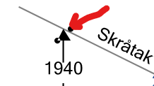 <svg viewBox="0 0 240 200" id="drawing"> <defs> <marker id="arrowheadSmall" markerWidth="13" markerHeight="13" fill="black" refX="7" refY="6" orient="auto"> <path d="M2,2 L2,11 L10,6 L2,2" style="fill: #000000;"></path> </marker> <pattern id="wallFill" width="4" height="10" fill="#E6E6E6" patternTransform="rotate(45 0 0)" patternUnits="userSpaceOnUse"> <line x1="0" y1="0" x2="0" y2="10" style="stroke:#ABABAB; stroke-width:1"></line> </pattern> </defs> <rect x="10" y="90" width="90" height="10" style="stroke:grey;stroke-width:1" fill="url(#wallFill)"></rect> <rect x="10" y="180" width="180" height="10" style="stroke:grey;stroke-width:1" fill="url(#wallFill)"></rect> <line x1="190" y1="190" x2="190" y2="70" style="stroke:grey;stroke-width:1"></line> <line x1="190" y1="70" x2="70" y2="10" style="stroke:grey;stroke-width:1"></line> <text fill="black" font-size="12px" dominant-baseline="middle" transform="translate(90,186)" text-anchor="middle">Gulv</text> <text fill="black" font-size="12px" dominant-baseline="middle" transform="translate(140,40) rotate(27)" text-anchor="middle">Skråtak</text> <line x1="200" y1="118" x2="200" y2="73" style="stroke:black" marker-end="url(#arrowheadSmall)"></line> <line x1="200" y1="130" x2="200" y2="177" style="stroke:black" marker-end="url(#arrowheadSmall)"></line> <line x1="100" y1="62" x2="100" y2="87" style="stroke:black" marker-end="url(#arrowheadSmall)"></line> <line x1="100" y1="48" x2="100" y2="28" style="stroke:black" marker-end="url(#arrowheadSmall)"></line> <text x="40" y="140" fill="black" font-size="12px" dominant-baseline="middle" text-anchor="middle">2380</text> <line x1="40" y1="133" x2="40" y2="103" style="stroke:black" marker-end="url(#arrowheadSmall)"></line> <line x1="40" y1="145" x2="40" y2="177" style="stroke:black" marker-end="url(#arrowheadSmall)"></line> <text x="110" y="140" fill="black" font-size="12px" dominant-baseline="middle" text-anchor="middle">2690</text> <line x1="110" y1="133" x2="110" y2="93" style="stroke:black" marker-end="url(#arrowheadSmall)"></line> <line x1="110" y1="145" x2="110" y2="177" style="stroke:black" marker-end="url(#arrowheadSmall)"></line> <text x="100" y="56" fill="black" font-size="12px" dominant-baseline="middle" text-anchor="middle">1940</text> <text x="200" y="125" fill="black" font-size="12px" dominant-baseline="middle" text-anchor="middle">3080</text> <line x1="150" x2="220" y1="70" y2="70" stroke="#2A579A" stroke-width="1" stroke-dasharray="4"></line> <path fill="none" stroke="#2A579A" stroke-width="1" d="M 177.3116909814869 64.08334433563022 A 14 14 0 0 0 176 70"></path> <text fill="#2A579A" font-size="12px" dominant-baseline="middle" transform="translate(162, 65)" text-anchor="middle">23 ° </text>