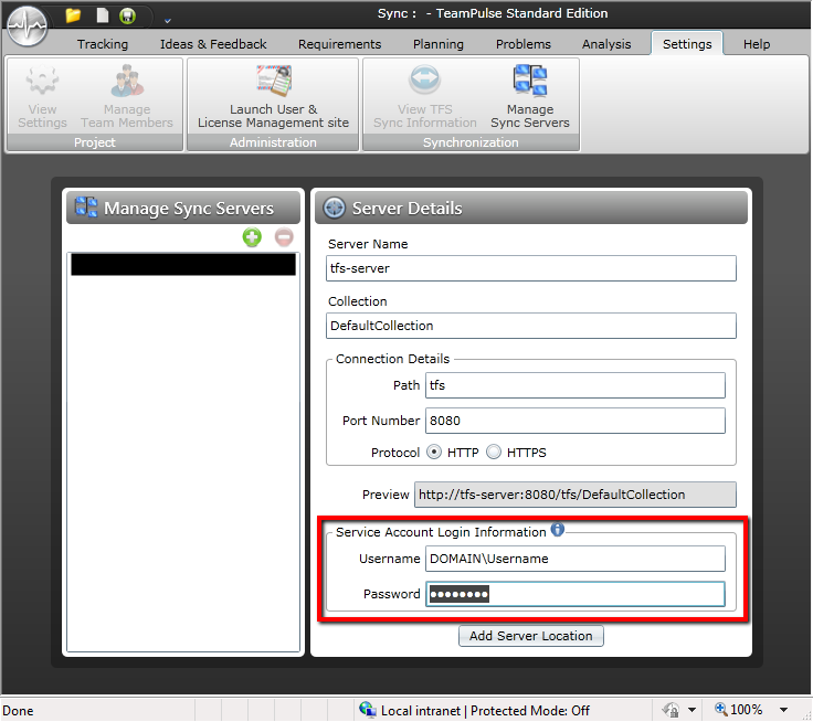 It is a bit confusing that you can specify one set of credentials to setup the project synchronization, and TeamPulse uses another set of credentials to do the actual sync. What is more confusing is that the error doesn't occur when using the Agile templates...