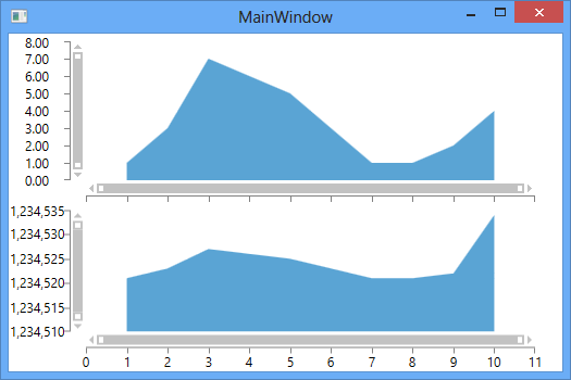 chart #1:<telerik:RadCartesianChartx:Name="DeviationChart"Grid.Row="1"HorizontalAlignment="Stretch"VerticalAlignment="Stretch"MaxZoom="{Binding MaxZoom}"MouseMove="Chart_OnMouseMove"PanOffset="{Binding PanOffset,Mode=TwoWay}"Style="{StaticResource ChartStyle}"Zoom="{Binding Zoom,Mode=TwoWay}"><telerik:ScatterAreaSeriesx:Name="DeviationSeries"Fill="{Binding DeviationFillColor}"ItemsSource="{Binding DeviationPoints}"Opacity="{Binding DeviationOpacity}"Stroke="{Binding DeviationColor}"StrokeMode="AllButPlotLine"StrokeThickness="{Binding DeviationThickness}"Tag="{BindingPath=Settings.PressureEU,Converter={StaticResource PressureEUConverter}}"XValueBinding="X"YValueBinding="Y"></telerik:ScatterAreaSeries><!-- ... --><telerik:RadCartesianChart.HorizontalAxis><telerik:LinearAxisx:Name="DeviationChartHorizontalAxis"MajorTickStyle="{StaticResource TopChartTickStyle}"Maximum="{Binding Path=ChartSettings.ChartMaxX}"Minimum="{Binding Path=ChartSettings.ChartMinX}"ShowLabels="False"Visibility="Collapsed"/></telerik:RadCartesianChart.HorizontalAxis><telerik:RadCartesianChart.VerticalAxis><telerik:LinearAxisx:Name="DeviationChartVerticalAxis"Title="{Binding Path=PressureBaseEUText}"LabelFormat="N2"LastLabelVisibility="Visible"Maximum="{Binding DeviationChartSettings.ChartMaxY}"Minimum="{Binding DeviationChartSettings.ChartMinY}"Style="{StaticResource LinearAxisStyle}"/></telerik:RadCartesianChart.VerticalAxis><telerik:RadCartesianChart.Grid><telerik:CartesianChartGridMajorXLinesRenderMode="All"MajorYLinesRenderMode="All"StripLinesVisibility="None"Style="{StaticResource CartesianChartGridStyle}"/></telerik:RadCartesianChart.Grid><telerik:RadCartesianChart.Behaviors><telerik:ChartPanAndZoomBehaviorPanMode="Both"ZoomMode="Both"/><telerik:ChartTrackBallBehaviorShowIntersectionPoints="False"ShowTrackInfo="True"SnapMode="None"/></telerik:RadCartesianChart.Behaviors></telerik:RadCartesianChart>